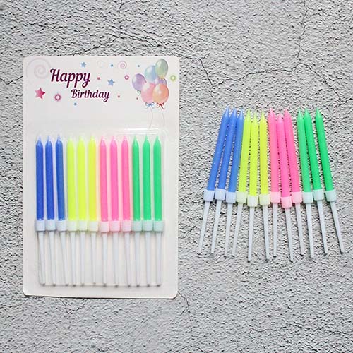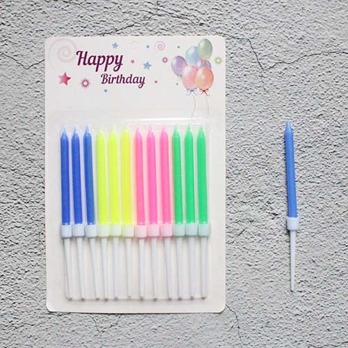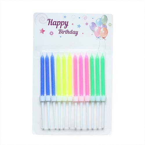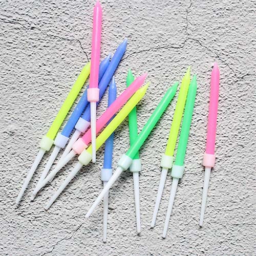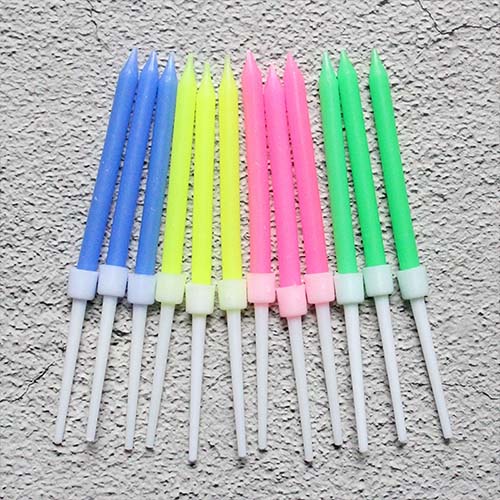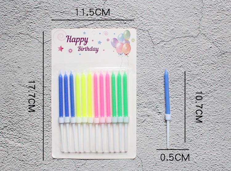 This colorful birthday candle features vibrant colors and a sturdy white PP base. Its overall design is simple and practical. With a total length of approximately 10.7cm, a diameter of approximately 0.5cm, and a base length of approximately 4.7cm, it is suitable for birthday parties, party decorations, and other occasions.