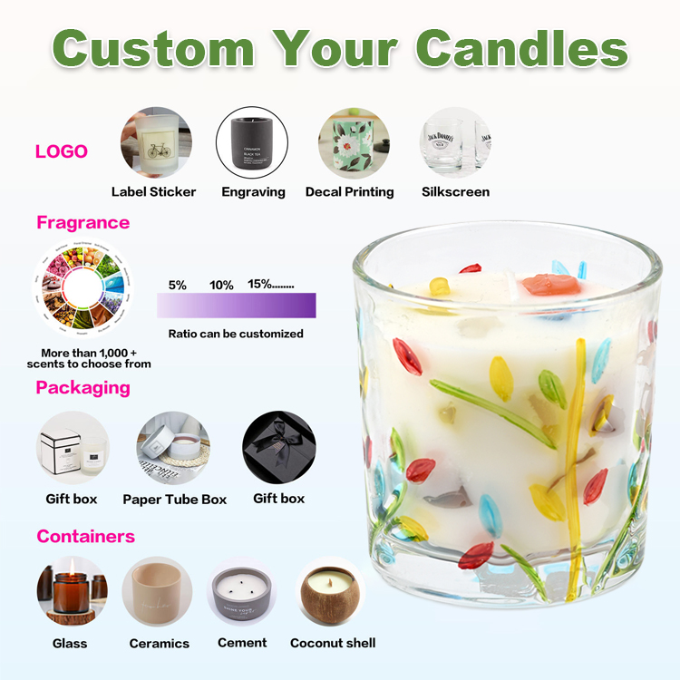 These colorful decorative gift candles are made from high-quality natural soy wax using a low-temperature burning technology. The wax melts evenly, leaving a clear, residue-free liquid, eliminating the pungent odor of traditional paraffin candles. Each glass is hand-painted with colorful floral patterns, making each design unique. After the candle burns out, the glass jar can be used as a pen holder, vase, or storage container, offering multiple uses and combining aesthetics with practicality.
